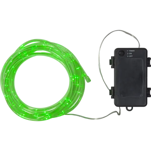 Skapa härlig partystämning med denna 5 m långa ljusslinga med grönt LED ljus. Batteribox för utomhusbruk. Timer