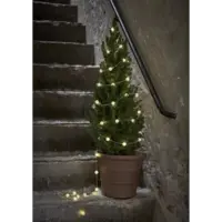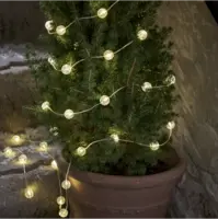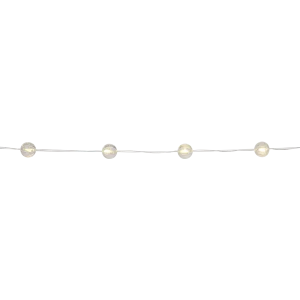 Batteridriven ljusslinga med 50 st varmvita LED och transparenta kuldekorationer. Batteribox för utomhusbruk med 8 olika blinksekvenser och timerfunktion. Härlig ljusslinga att inreda med i trädgården till vardags och fest. Ger ett vackert sken i mörkret.