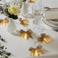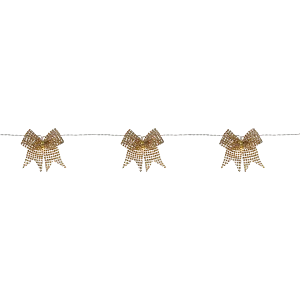 Batteridriven inomhusslinga med dekorationer i form av guldfärgade rosetter och 10 varmvita LED. Smakfull ljusslinga som passar lika bra till julgranen som bordsdekoration. Timerfunktion i batteridosan.