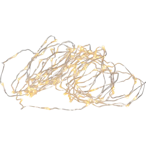 Dekorativ ljusslinga med 100 stycken varmvita LED dew drops. Kan användas vid diverse dekorationer, vid tex dukningar, blomsterarrangemang, i fönster, på väggen osv. Slingan är silverfärgad och 5 m lång