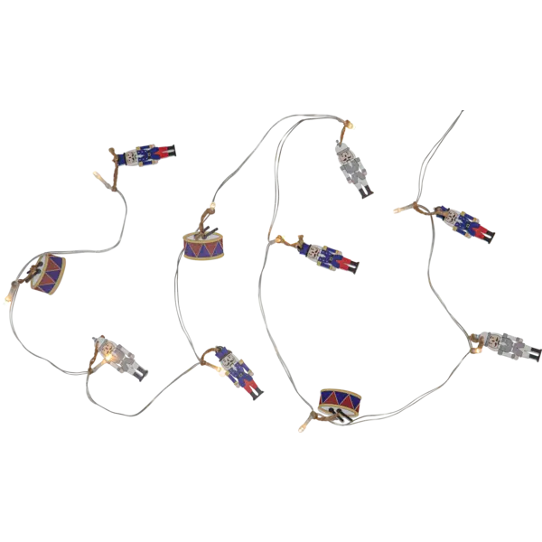 Ljusslinga för inomhusbruk dekorerad med 10 st träfigurer i färgerna blå/grå/vit och röd. Figurerna är fastknutna med hampasnöre. Dekorativ inredning som ger ett mysigt sken i hemmet. Passar perfekt till våra övriga produkter i Nutcracker serien.