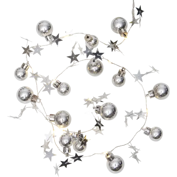 Liten nätt batteridriven ljusslinga med silverdekorationer. 10 st ljuspunkter av dewdrops. Kan användas vid diverse dekorationer, vid tex dukningar, blomsterarrangemang, i fönster, på väggen osv. Den inbyggda timern gör det lätt att ställa in när produkten ska lysa.