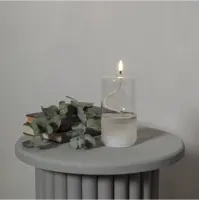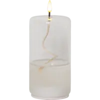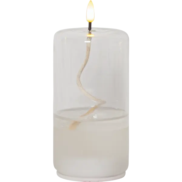 Flamme Float är ett ljus med glasbehållare med transparent vax inuti som ger en känsla av oljeljus där veken flyter. Det genomskinliga vaxet kan innehålla luftbubblor vilket ger ett än mer naturtroget utseende. Ljuset är cirka 8×17,5cm inklusive lågan som sticker upp ur glaset. Detta elektriska ljus blir en vacker dekoration, både ensam och i grupp ihop med övriga ljus från vår Flamme Float serie. Den har timerfunktion och när brytaren är på timerläget lyser ljuset i ca 30 dagar med en vacker realistisk låga i varmvitt. Den drivs av 3 AAA batterier, dessa ingår ej.