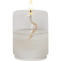 Flamme Float är ett ljus med glasbehållare med transparent vax inuti som ger en känsla av oljeljus där veken flyter. Det genomskinliga vaxet kan innehålla luftbubblor vilket ger ett än mer naturtroget utseende. Ljuset är cirka 8x13cm inklusive lågan som sticker upp ur glaset. Detta elektriska ljus blir en vacker dekoration, både ensam och i grupp ihop med övriga ljus från vår Flamme Float serie. Den har timerfunktion och när brytaren är på timerläget lyser ljuset i ca 30 dagar med en vacker realistisk låga i varmvitt. Den drivs av 3 AAA batterier, dessa ingår ej.