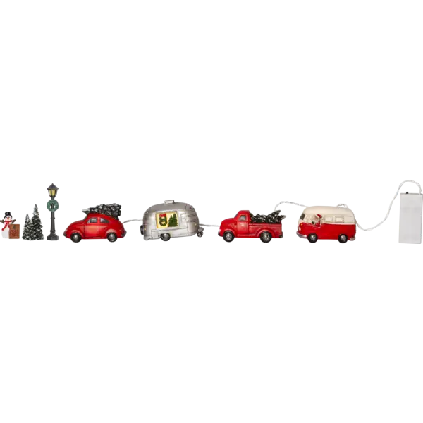 Dekorations set med 8 delar, passar perfekt som dekoration till jul. Setet består av tre fordon, en husvagn, lyktstolpe, granar, snögubbe och en ljussslinga. Det lyser fint i bilarna och husvagnen när produkten är på. Produkten drivs av batteri. Placera på ett bord eller en hylla för en härlig julstämning.