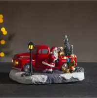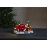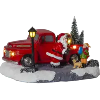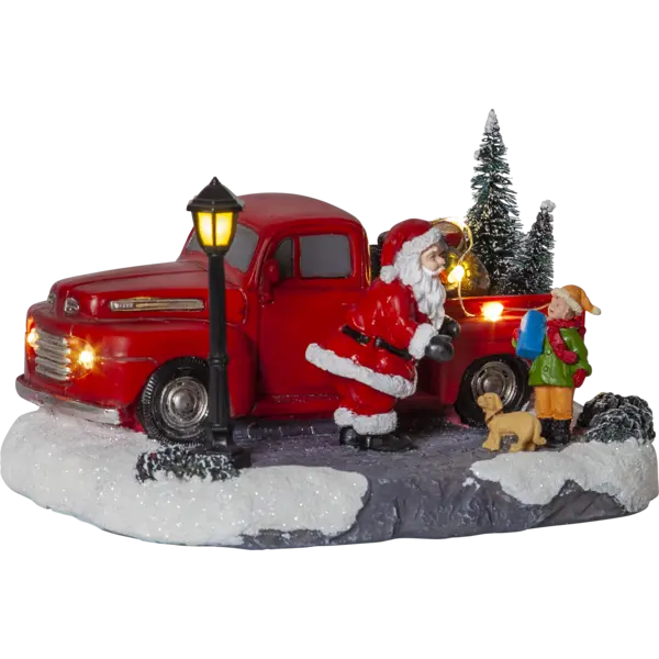 Dekorativt sceneri, jultomten har stannat sin lstbil och klivit ur för att prata med barnet och hunden, Små led dioder lyser och ger en fin ljusbild. Placera på ett bord eller på en hylla och få en härlig julkänsla.