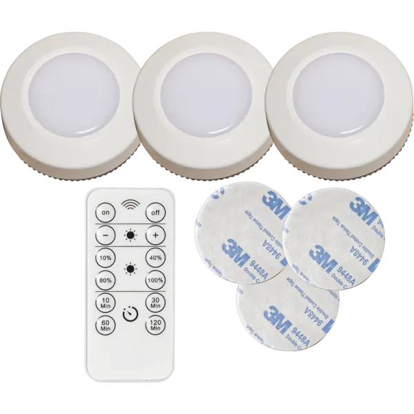 3-pack LED-puckmed fjärrkontroll och timer. Perfekt för garderober, förråd och andra mörka vrår där man behöver en liten extra ljuspunkt. Inbyggd push-funktion. Lampan blinkar till när man sätter den i timer-läge. Fästs med hjälp av den självhäftande tejpen på baksidan. Varje ljuskälla drivs med 3st AAA-batterier (ingår ej)