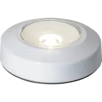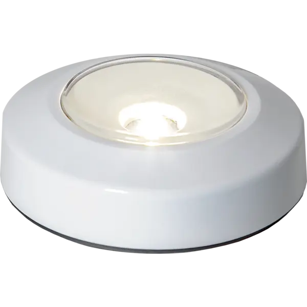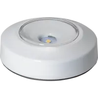 Rund LED-puck, perfekt för garderober, förråd och andra mörka vrår där man behöver en liten extra ljuspunkt. Inbyggd push-funktion, för att tända lampan trycker man bara mitt på den. Lampan fäst med hjälp av den självhäftande tejpen på baksidan. Drivs med 3st AAA-batterier (ingår ej)