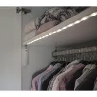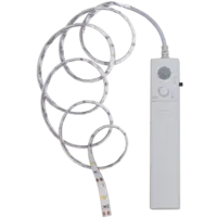 Batteridriven 1m LED ljusremsa. Varmvitt ljus som kan tändas med på-knappen eller genom rörelse. Monteras enkelt tex under en säng eller i en garderob med hjälp av tejpen på baksidan av remsa och batteribox.