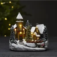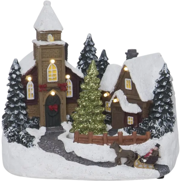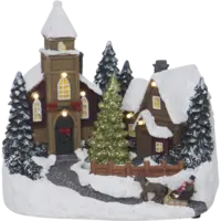 Stämningsfull by med en lite kyrka och ett hus. Det lyser fin i kyrkan och huset när produkten är på. Produkten driv av batteri och har timerfunktion. Placera på ett bord eller en hylla för en härlig julstämning.