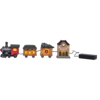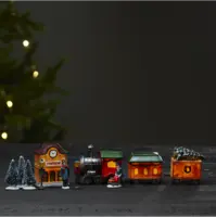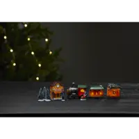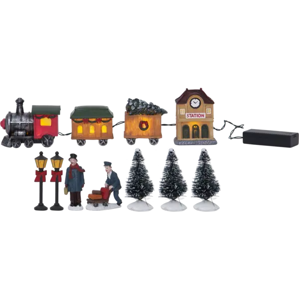 Dekorations set med 12 delar, passar perfekt som dekoration till jul. Setet består av lokomotiv, två vagnar och ett litet stationshus, dessa lyser fint när produkten är på. Det ingår också två lyktstolpar, två figurer och tre granar. Produkten driv av batteri. Placera på ett bord eller en hylla för en härlig julstämning.