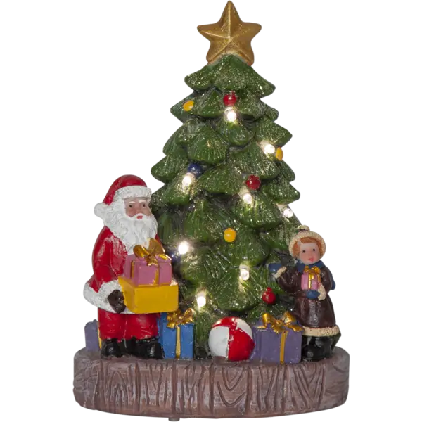 Detaljrik dekoration, gran med tomte och paket. Det lyser fint i granen av små dew drops. Batteri funktion med timer. En stämmningsful juldekoration som ger det lilla extra till juldekorationen.