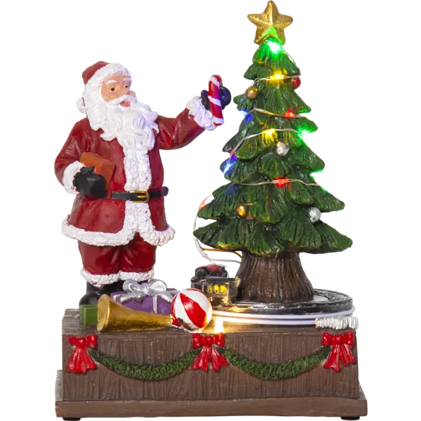 Juldekoration med tomten vid julgranen, det lyser fint i granen av små led lampor. Julgranen roter. Dekorera till advent och jul och få en härlig julkänsla som passar både barnrummet och på en hylla.
