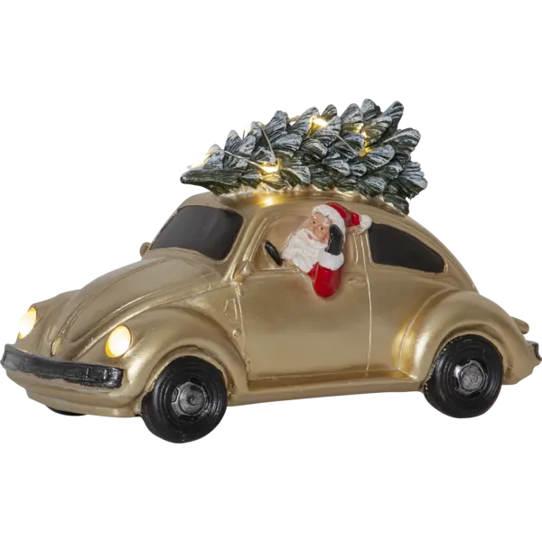 Dekorativ julbil i guldfärg, jultomten sitter i och granen ligger på taket. Lyser i strålkastarna fram på bilen. Placera på ett bord eller på en hylla och få en härlig julkänsla