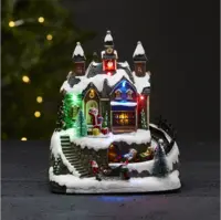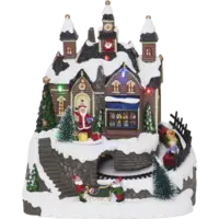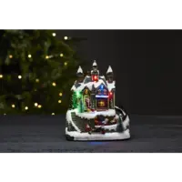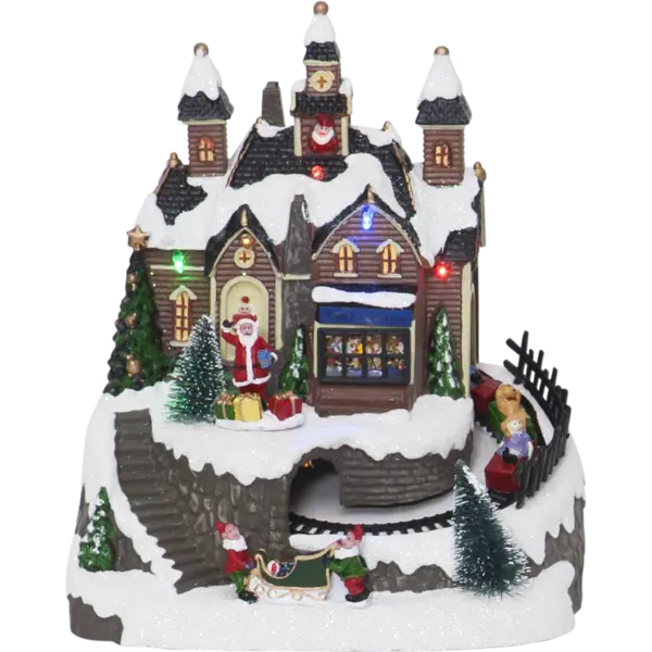 Dekorativ julby, hus med torn, det lyser stämningsfullt i fönster, Tomten står utanför och vinkar. Nissarna är på vägg upp till huset med sin släde. Det lyser stämningsfullt av små led lampor i olika färger och ett tåg roterar under huset. Välj mellan funktionerna endast ljus eller ljus/roterande tåg och 8 melodier. Båda funktionerna har timer. Dekorera på en hylla eller byrå för extra härlig julkänsla.