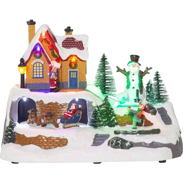En härlig juldekoraion med snögubben som ser ut over de skridsko åkande barnen och tomten med sin släde och reanar. Huset har fina lyktor som lyser. Alltihop ger en fantastisk julkänslan. Staden har en roterande skridskobana, tomte med släde och renar som roterar och om man vill spelar byn 8 julsånger. Dekorera med till advent och jul, passar både barnrummet och på en byrå i hallen.