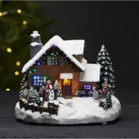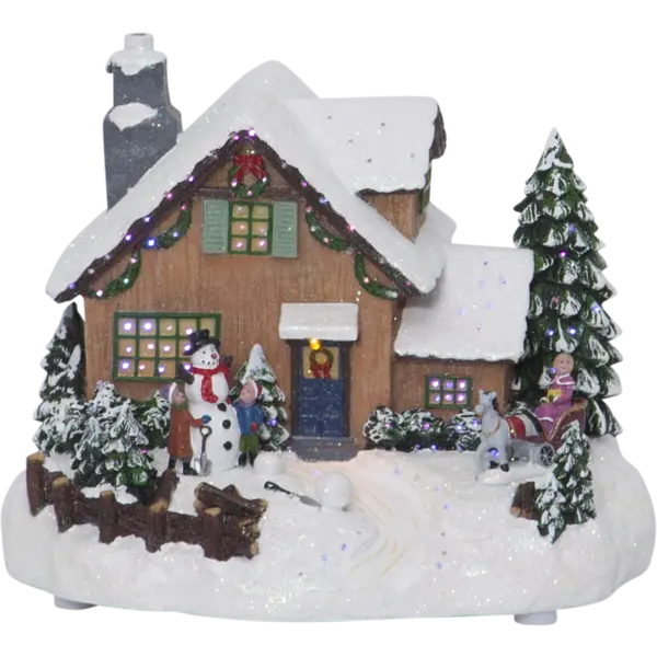 Stämningsfull dekoration till jul och advent, ett juldekorerat hus i vinterlandskap med en snögubbe, taket, granar och lekande barn. Produkten driv av batteri och har timerfunktion. Placera på ett bord eller en hylla för en härlig julstämning.