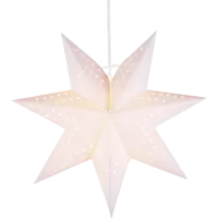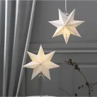 Vit pappersstjärna med fina dekorativa mönster. En vacker stjärna att dekorera med i fönstret. Stjärnan har plats för en ljuskälla.