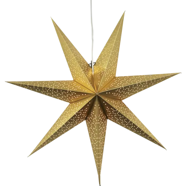 Mönstrad pappersstjärna i färgen guld. En vacker stjärna att dekorera med i fönstret. Stjärnan har plats för en ljuskälla. Höjden är 70cm.
