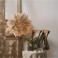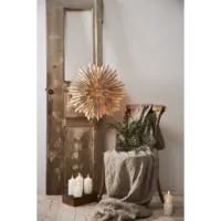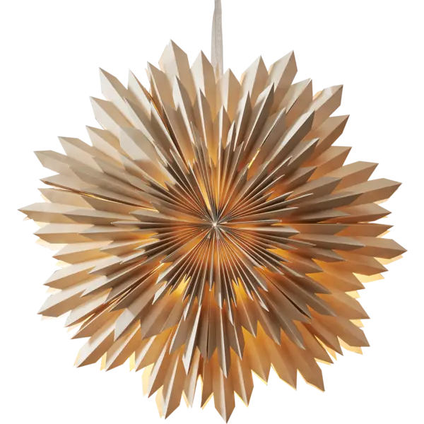 Fantastisk beige pappersstjärna som är tillverkad av tre lager veckat papper. Konturen är lite ojämn för en vintrigare känsla. Ett elegant band ingår för att lättare kunna hänga upp stjärnan. Stjärnan sprider stämning och ger hemmet den där speciella julkänslan. Kan hängas både i förnster och mot en vägg.