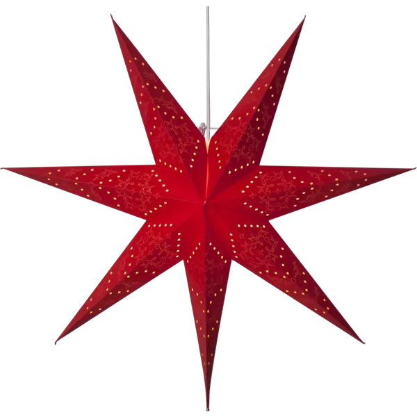 Mönstrad pappersstjärna i röd design. Fin stjärna att dekorera med i fönstret. Stjärnan har plats för en ljuskälla. Höjden är 70cm.