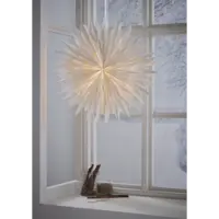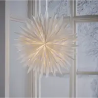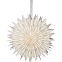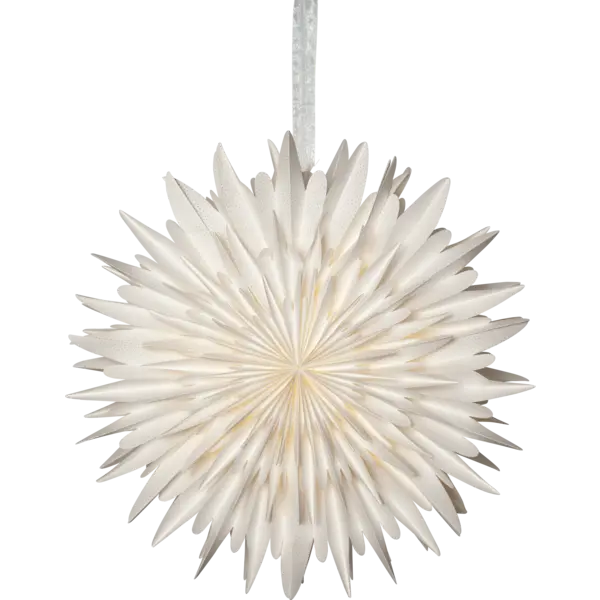 Fantastisk vit pappersstjärna som är tillverkad av tre lager veckat papper. Konturen har runda flickar som gör att stjärnan ser busigt vintrig ut. Ett elegant band ingår för att lättare kunna hänga upp stjärnan. Adventsstjärnan skapar en perkeft julstämning och ger hemmet den där speciella julkänslan. Kan hängas både i förnster och mot en vägg. Köp till sladdställ och ljuskälla för belysning i stjärnan.