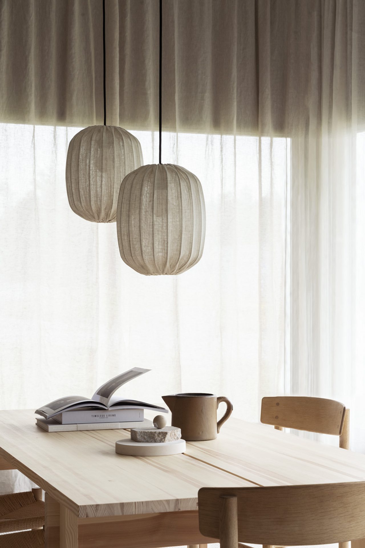 Prisma 25 linen Natural är en taklampa klädd med en mjuk, varm linnetextil som ger en rofylld känsla i rummet. Svävar lättsamt och blir en stillsam inredningsdetalj i rummet. Tyget klär en formstark stålram som förstärker lampans form och blir synlig när lampan tänds. Prisma 25 linen Natural passar perfekt ovanför det lilla köksbordet, i par ovanför en köksö, eller för att lysa upp ett mörkt hörn ett vardagsrum. Köp tillsammans med något av våra takupphängset och LED-ljuskällor.Höjd cm 30 Diameter cm 25 Färg Natur Finish Matt Material Linne Sockel E27 Takupphäng Ingår ej