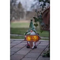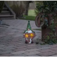 Vår solcellsdekoration Gnomy är en trädgårds tomte i mångfärgad polyresin med många vackra detaljer och en välkomstskylt som skiner i mörkret. Denna solcellsbelysning är lättplacerad och är en vacker dekoration både på dagen och natten i din trädgård, balkong eller terrass. Placera solcellsdekorationen där solen kan nå panelen under dagen för att få ultimat laddning till det medföljande batteriet.