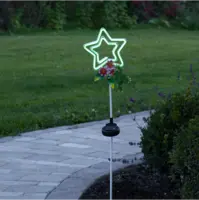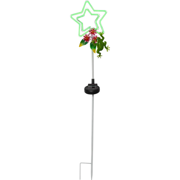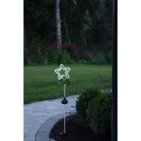 Solcellspinnen Linny Star är en trädgårdsdekoration i form av en stjärna och med färgade metalldekorationer nertill. Solcellen blir en vacker dekoration och är lättplacerad i en plantering i trädgården eller på en balkong eller terrass. Stjärndelen lyser upp med grön neon-rope under natten. Placera solcellsdekorationen där solen kan nå panelen under dagen för att få ultimat laddning till det medföljande batteriet.