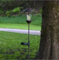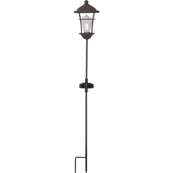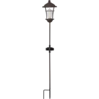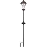 Solcellsdekoration i form av en lykta på pinne i brun färg. Lyser upp i trädgården eller på balkongen med varmvita filament LED under mörkret