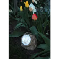 Solcellsdriven dekoration som är formad som en sten. Placera stenen i rabatten och få ett fint sken i trädgården. Enkelt, praktiskt och miljövänligt sätt att dekorera med i trädgården.