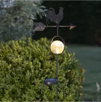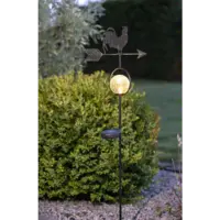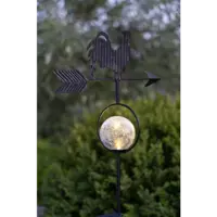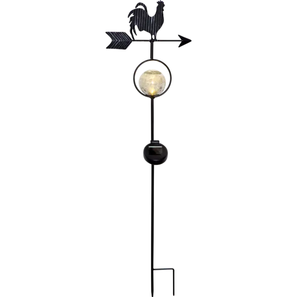 Solcellsdekoration i form av vindflöjel med tupp och vindriktningspilar som roterar med vinden. Ett varmvitt sken lyser under natten genom glaskulan.
