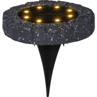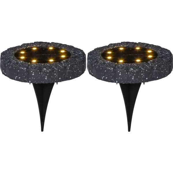 2 pack gräsmattebelysning som drivs av solcell. Dessa solcellsbelysningar lyser upp under natten med 5 Lumen. De är enkla att placera i mjukare gångar och gräsmattor genom att den medföljande markpinnen sticks ner i marken. Solcellslamporna är tillverkade i polyresin och är grå med vita prickar vilket gör att de lätt smälter in i din trädgård. Tänk på att placera dem så solen kan ladda upp det medföljande batteriet under dagen.