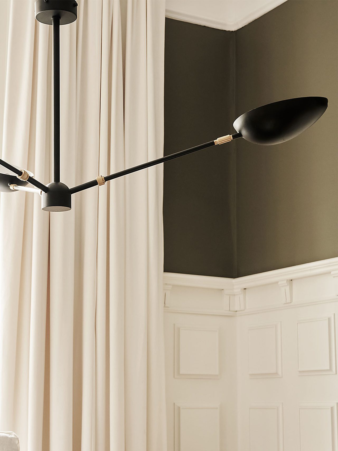 Ge rummet en elegant retro känsla med Spoon Ceiling Pendant. Ett lekfullt blickfång i rummet med sina tre riktbara skärmar. Taklampan har en sofistikerad matt finish och skärmar med vit matt insida för en funktionell ljusbild. Stilrena och väl genomtänkta mässingsdetaljer som lyfter designen.Höjd cm 58 Diameter cm 150 Färg Matt svart/mässing Material Stål/mässing Material sladd Textil Färg sladd Svart Sockel E27 Max watt 20 Watt Takupphäng Ja