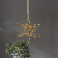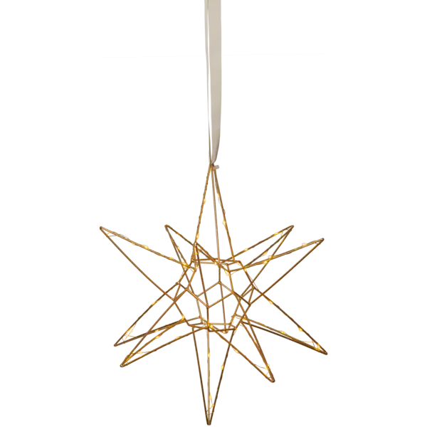 Vacker 3D stjärna i guld metall för inomhusbruk. Stjärnan har 60 LED-ljuskällor med varmvitt sken. Fin dekoration att hänga eller placera på en skänk. Dekorera till andvent och jul för en magisk julkänsla.