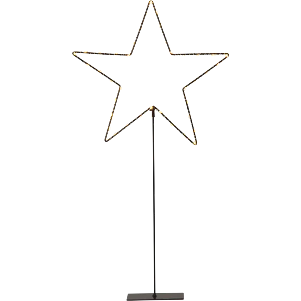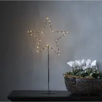 Dekorativ metallstjärna på fot med dew drop ljusslinga för inomhusbruk. Stjärnan har 40 LED-ljuskällor med varmvitt sken. Fin dekoration att ställa i fönstret eller mot en väggen.