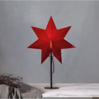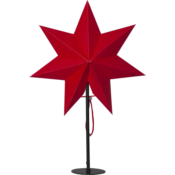 Röd stjärna med svart fot. Elegant juldekoration, lätt att placera och passar utmärkt i ett fönster eller på en skänk. Stjärnan har plats för en ljuskälla. Höjden är 55cm.