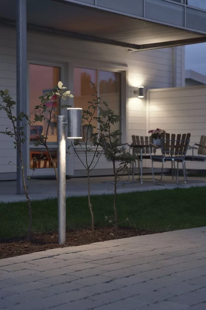 Ull trädgl LED upp/ned är IP44-klassad, vilket innebär att den är skyddad mot vattenstänk och är lämplig för utomhusbruk. Den är också utrustad med en jordspett, vilket gör den enkel att placera i marken eller i gräsmattan. Du kan enkelt justera belysningens riktning genom att vinkla armaturen uppåt eller nedåt.