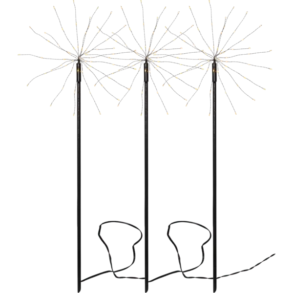 Firework för utomhus bruk. Lys upp trädgården med dessa stämningsfulla dekorationer. 3 pinnar med 1 meter kabel mellan varje pinne. 180 varmvita ljuspunkter fördelade på de tre pinnarna.