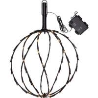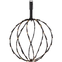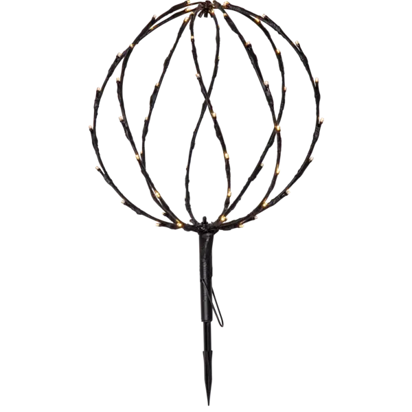 Dekorativt svart klot med 64 varmvita ljuspunkter, 30cm i diameter. Ger ett härligt ljus till din trädgård. Produkten kan användas som både hängande och stående, markspettet är avtagbart och det finns en krok för upphäng, för att inte belasta kabeln använd en kedja eller rep att hänga klotet i. Batteribox för utomhusbruk. Klotet är ihopvikbart vilket sparar utrymme när den inte används.