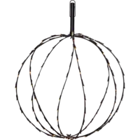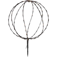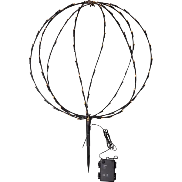 Dekorativt svart klot med 104 varmvita ljuspunkter, 50cm i diameter. Ger ett härligt ljus till din trädgård. Produkten kan användas som både hängande och stående, markspettet är avtagbart och det finns en krok för upphäng, för att inte belasta kabeln använd en kedja eller rep att hänga klotet i. Batteribox för utomhusbruk. Klotet är ihopvikbart vilket sparar utrymme när den inte används.