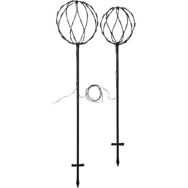 Dekorativ utomhusbelysning i set av 2 svarta runda klot med tillsammans 96 varmvita ljuspunkter. 2,5 m kabel mellan kloten gör produkten lättplacerad i din trädgård, på altanen eller balkongen. Höjden på kloten är 130cm och 110cm med en diameter på 28cm respektive 23cm. Med transformator som är IP44 klassad.