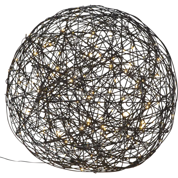 Dekorativ svart version av Trasselbollen för både inom- och utomhusbruk. Inuti dekorationen finns en LED-ljusslinga som avger ett varmvitt sken. Designad av Charlotte Falck.