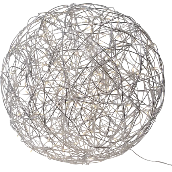 Dekorativ silverfärgad version av Trasselbollen för både inom- och utomhusbruk. Inuti dekorationen finns en LED-ljusslinga som avger ett varmvitt sken. Designad av Charlotte Falck.