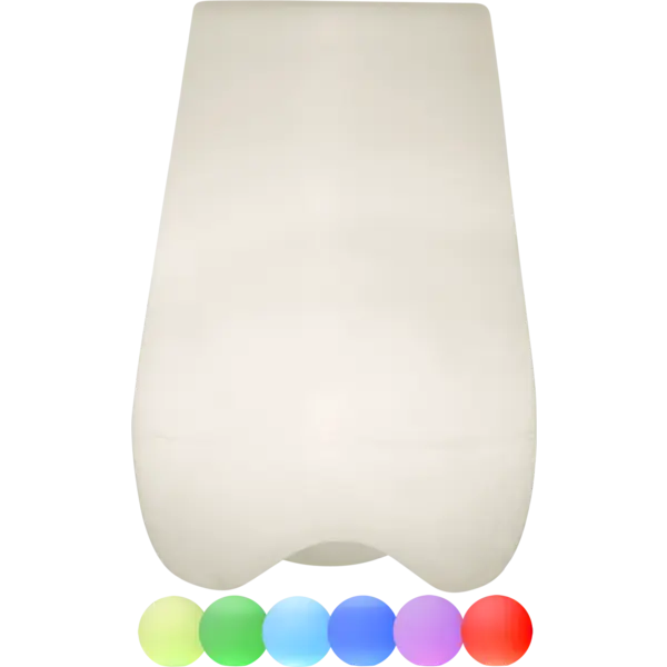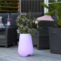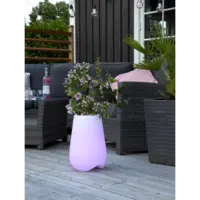 Mycket fin utom-och inomhus produkt med fjärrkontroll. Du kan välja skiftande färger eller ett fast ljus på en färg. Både uppladdningsbara batterier och transformator följer med. För att ladda batterierna använder man transformatorn. När batterierna är fulladdade lyser produkten upp till 8 timmar. Krukan kan användas till blommor eller varför inte lägga champagne på kylning i lite is.