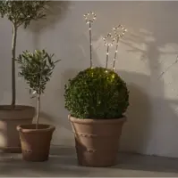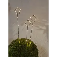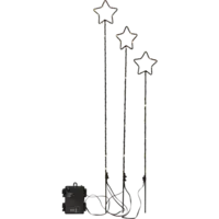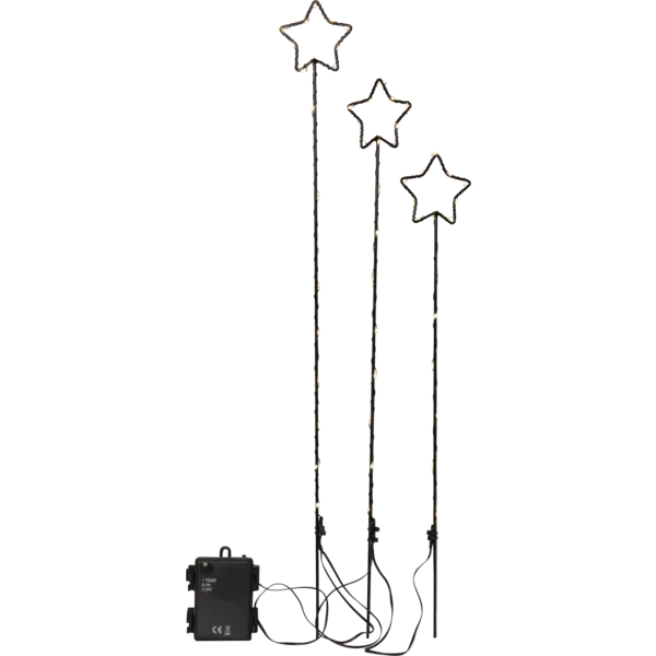 Batteridriven utomhusdekoration med 3 stjärnor på svarta metallpinnar. 54 varmvita LED fördelade på 3 pinnar med höjd 60, 53 och 46cm. Snygg dekoration för trädgården. Batteribox med timerfunktion.
