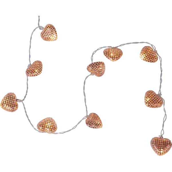 Vacker ljusslinga dekorerad med hjärtan. Ljusslingan har 10 varmvita LED-lampor. Kan användas vid diverse dekorationer, vid tex dukningar, blomsterarrangemang, i fönster, på väggen osv. Slingan är batteridriven och har en smidig timerfunktion.