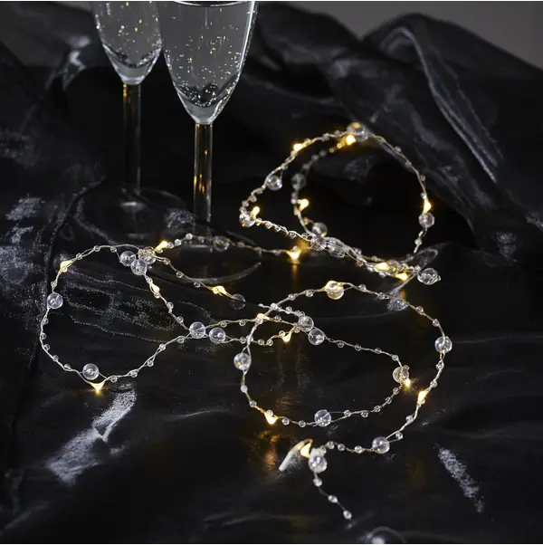 Liten nätt batteridriven led ljusslinga med klara pärlor, 20 st. ljuspunkter av dewdrops. Kan användas vid diverse dekorationer, vid tex dukningar, blomsterarrangemang, i fönster, på väggen osv. Den inbyggda timern gör det lätt att ställa in när produkten ska lysa.