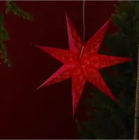 Röd pappersstjärna med hålmönster och struktur. Stämningsfull stjärna att hänga upp i fönstret för att skapa julkänsla. Papper av återvunnen bomull.