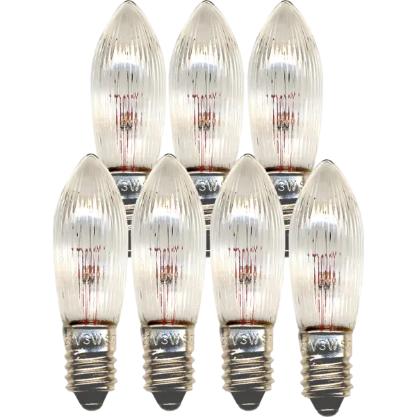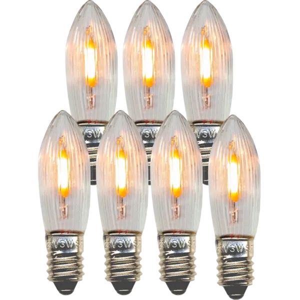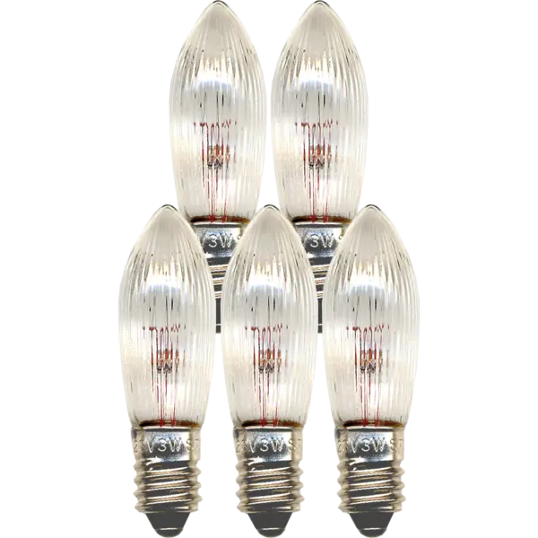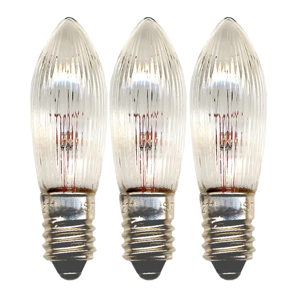 3-pack topplampor med E10 sockel och klart glas. Denna produkt passar till våra 9-armade eller 11-armade ljusstakar med stickkontakt. Användningsområdet är inomhus.